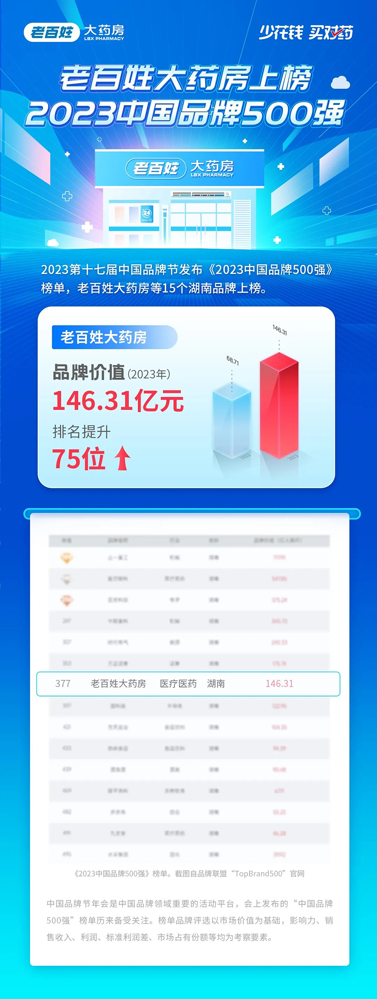 作為中國品牌領(lǐng)域高規(guī)格、大規(guī)模的宣傳展示自主品牌形象的活動平臺,中國品牌節(jié)深具權(quán)威、廣泛的影響力。中國品牌榜單評選參考國際標(biāo)準(zhǔn),以市場價(jià)值為基礎(chǔ),綜合考察品牌影響力、銷售收入、利潤、標(biāo)準(zhǔn)利潤差、市場占有份額等因素。根據(jù)《2023中國品牌500強(qiáng)》榜單,本次湖南共有15個(gè)品牌上榜,其中,老百姓大藥房品牌價(jià)值及排位提升最大:2023年老百姓品牌價(jià)值146.31億元,較去年68.71億元“身價(jià)”大幅翻倍;全國排名提升了75位,躍至377位,品牌實(shí)力再進(jìn)階。